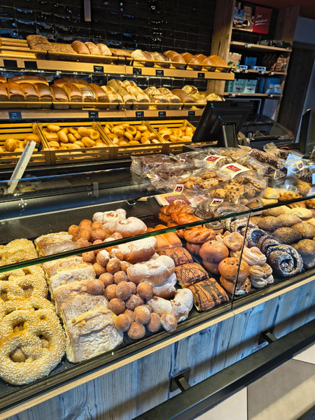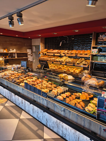 Das ist unser Hauptgeschäft – direkt dahinter befindet sich unsere Backstube, in der täglich frisch gebacken wird. In der Brachter Straße betreiben wir außerdem eine kleine Lebensmittelabteilung mit ausgewählten Frischeartikeln. Dort finden Sie auch unseren Verkaufsautomaten für den Einkauf rund um die Uhr (24/7) sowie eine Lotto-Annahmestelle.